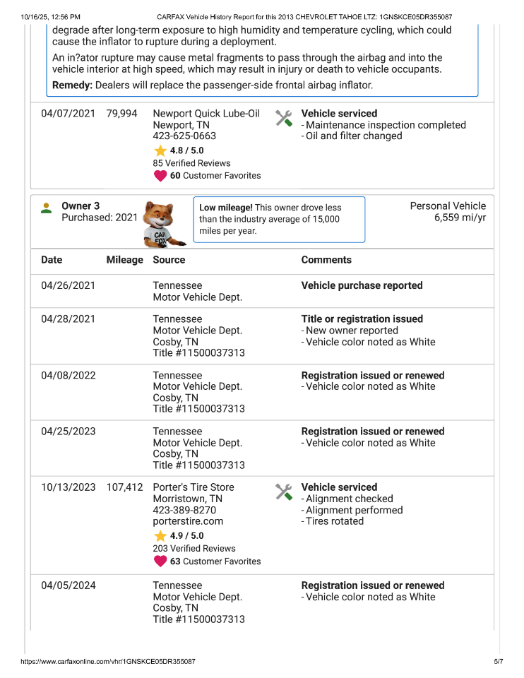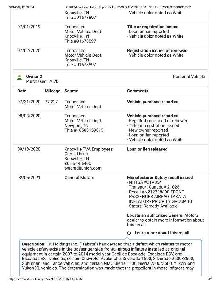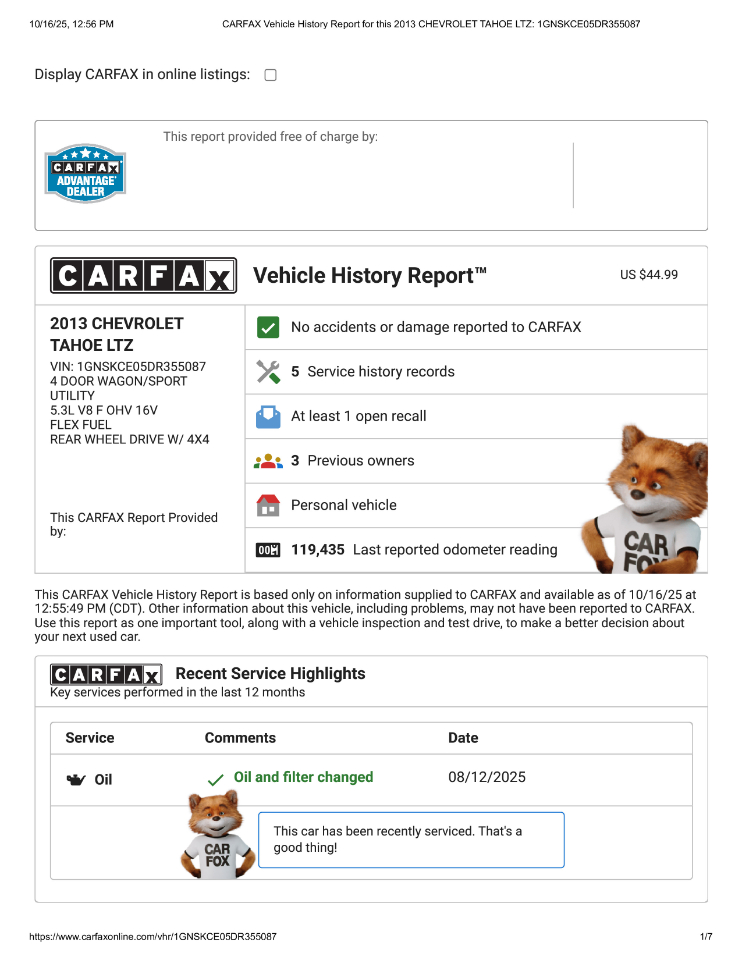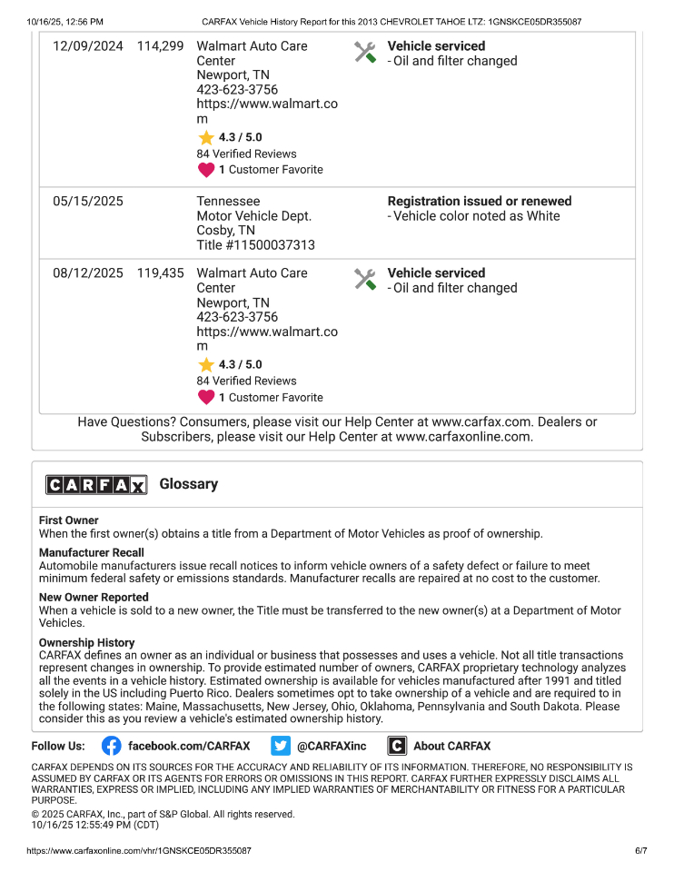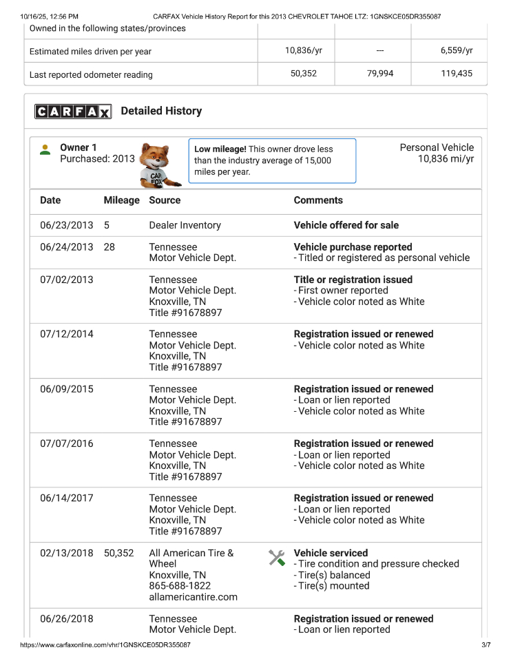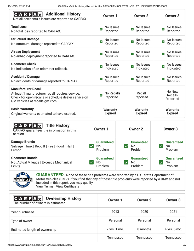 This 2013 Chevrolet Tahoe LTZ Has Had 3 Previous Owners in TN, No Accidents, and Is In Good Condition. See Pics and Walk-Around Video for Detailed Condition.