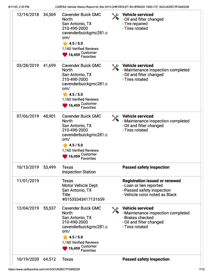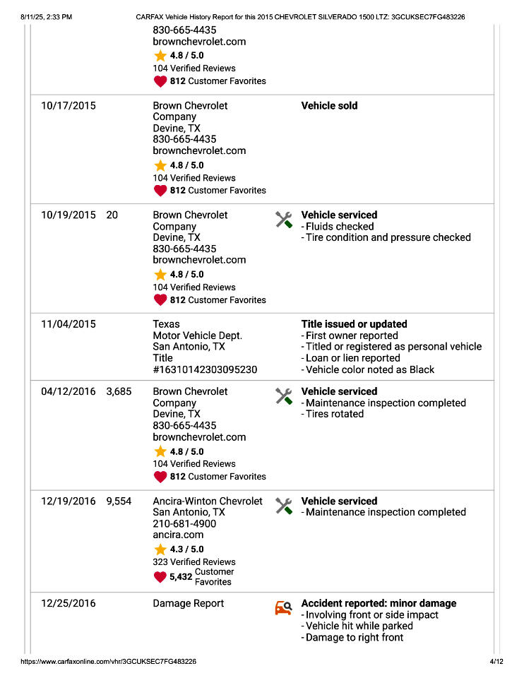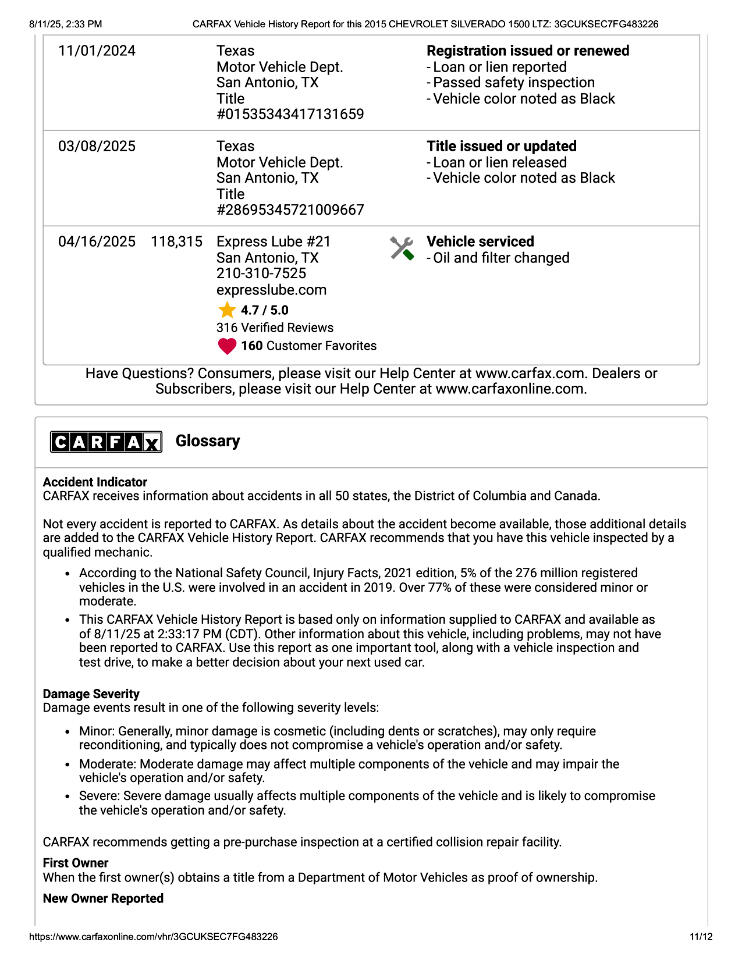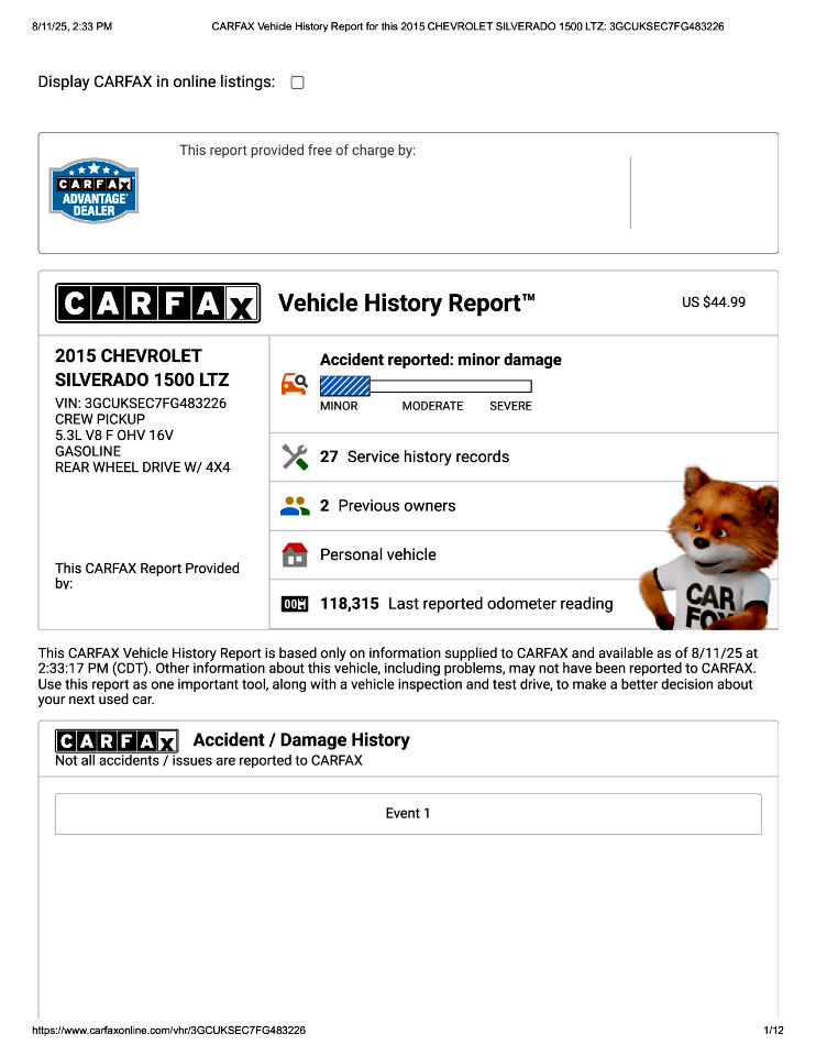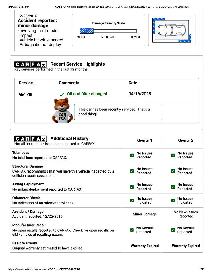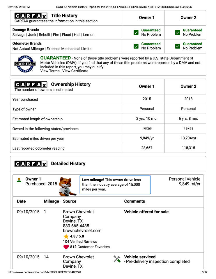 This 2015 Chevrolet Silverado 1500 LTZ Z71 Has Had 2 Previous Owners in TX, 1 Minor Damage Report, and Is In Good Condition. See Pics and Walk-Around Video for Detailed Condition. CarFax Defines Minor Damage As "usually cosmetic, including dents or scratches to the vehicle body."
