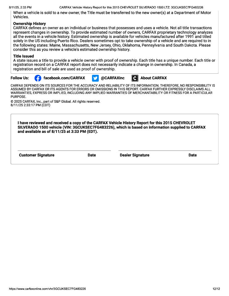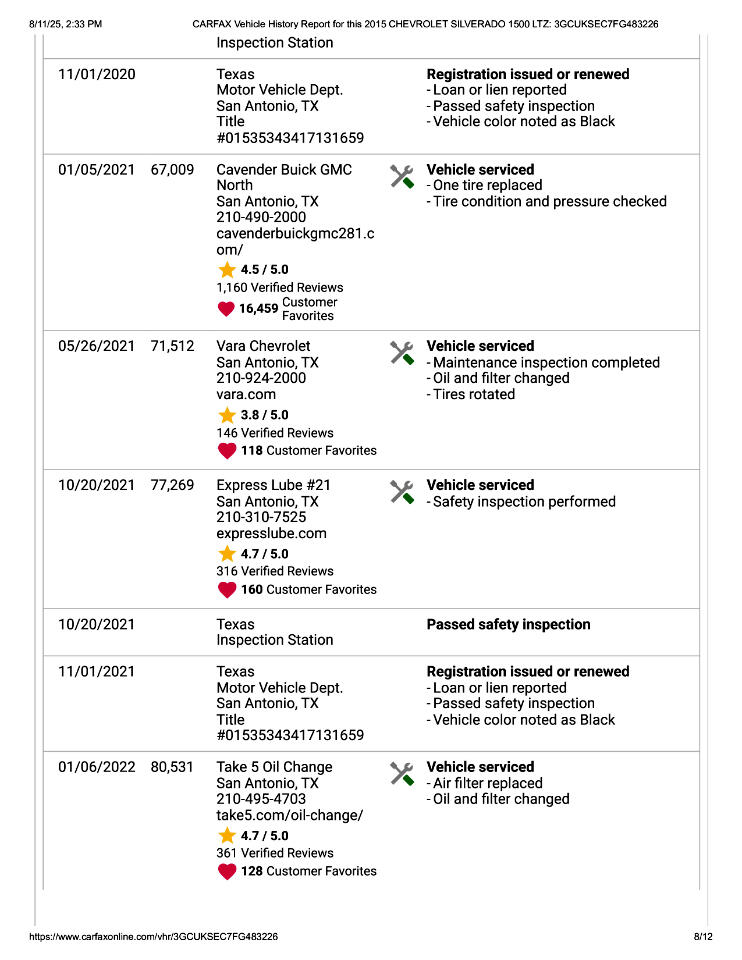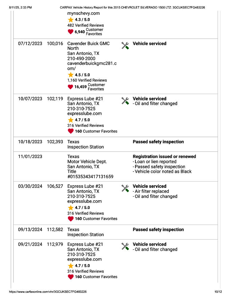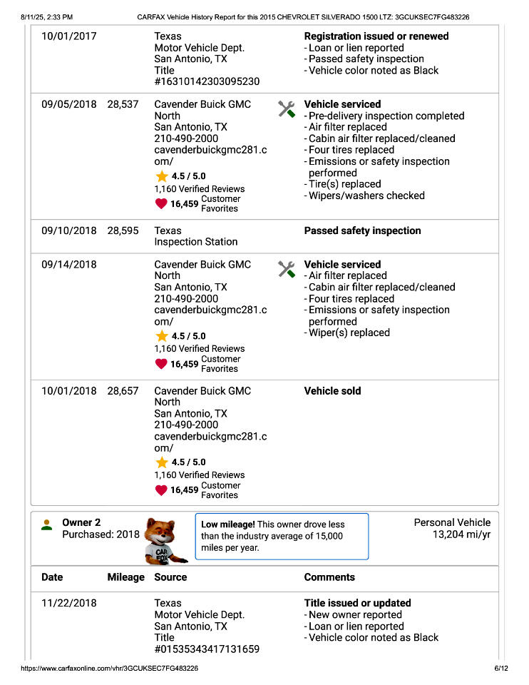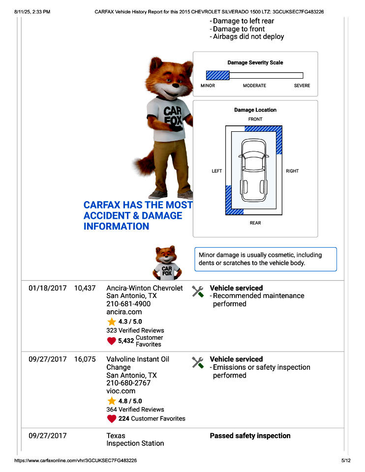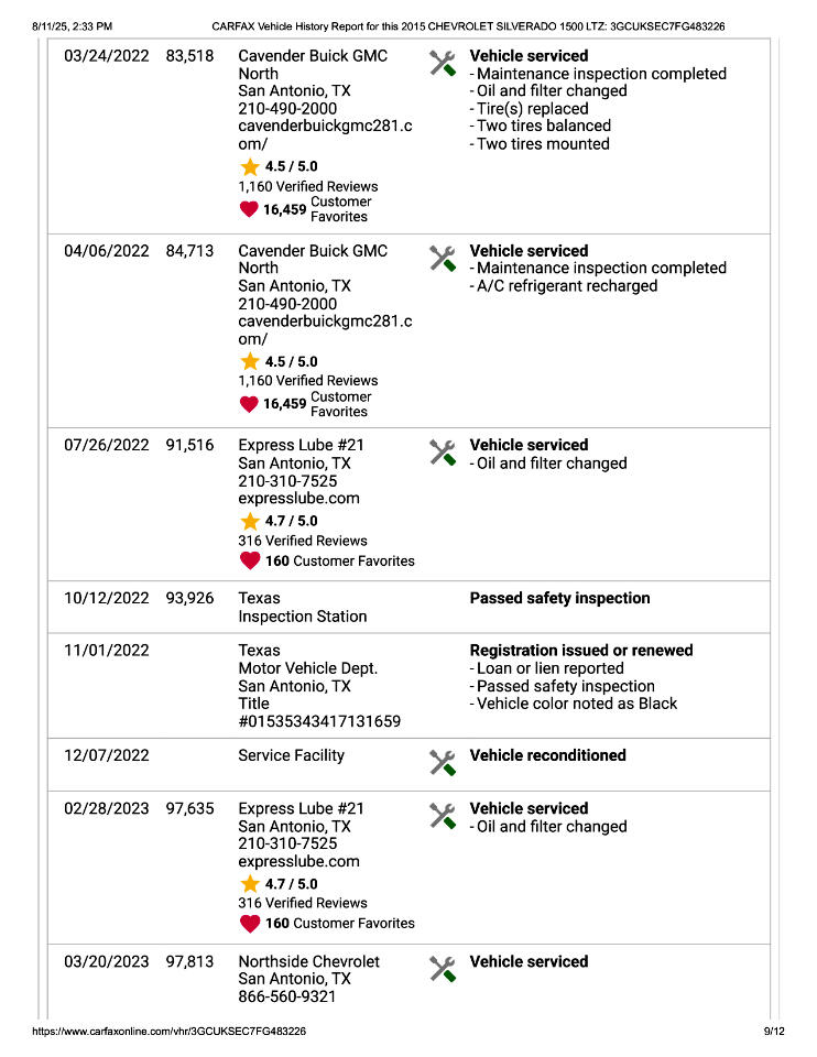 This 2015 Chevrolet Silverado 1500 LTZ Z71 Has Had 2 Previous Owners in TX, 1 Minor Damage Report, and Is In Good Condition. See Pics and Walk-Around Video for Detailed Condition. CarFax Defines Minor Damage As "usually cosmetic, including dents or scratches to the vehicle body."